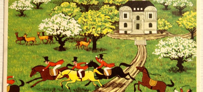 Postkortet med herrerne i de røde frakker, som rider af sted i så høj fart, at en af rytterne falder af hesten, er interessant. Slottet i baggrunden er Erimetageslottet i Jægerborg Dyrehave, så der må være tale om et motiv fra Erimetagesletten. I slutningen af 1950’erne boede Karen Kjærsgaard i Søllerød kun få km fra Dyrehaven, så det er sandsynligt, at hun har hentet inspiration til postkortet på en vandretur på Erimetagesletten. Måske har hun endda overværet Hurbertusjagten, som foregår her hvert år den første søndag i november. Det har den gjort næsten uden afbrydelser siden år 1900. Rytterne i Hubertusjagten er netop klædt i røde frakker og hvide bukser. Hubertusjagten er ikke nogen egentlig jagt på trods af navnet. Det er et hesteforhindringsløb, som har taget navn efter jagtens skytshelgen Hubertus. Lidt duft af jagt er der dog over begivenheden, idet der er tale om en symbolsk videreføring af den såkaldte par force jagt, som er hele baggrunden for, at dyrehaven blev anlagt af Christian d. 5 fra 1670 og frem. Her blev der anlagt veje i stjerneformation, hvor man kunne drive par force jagten, som var en udmattelsesjagt, der gik ud på med heste og hunde at jage en kronhjort i timevis til den segnede af udmattelse, hvorefter kongen kunne stige ned fra sin hest og dræbe hjorten med et sværd.