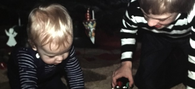 Efter at jeg i mit seneste blogindlæg helt uventet lagde mærke til Karen K. julepynt på et af vores familiebilleder fra 1977, har jeg været hjemme hos min far og kigge en ekstra gang på de øvrige gamle lysbilleder fra julen 1977. For at se, om min mor mon havde hængt mere Karen K. julepynt på træet det år. Og minsandten. Her leger min bror og jeg forsat med biler på gulvtæppet, og i baggrunden ses et Karen K. kræmmerhus med en syngende engel:
