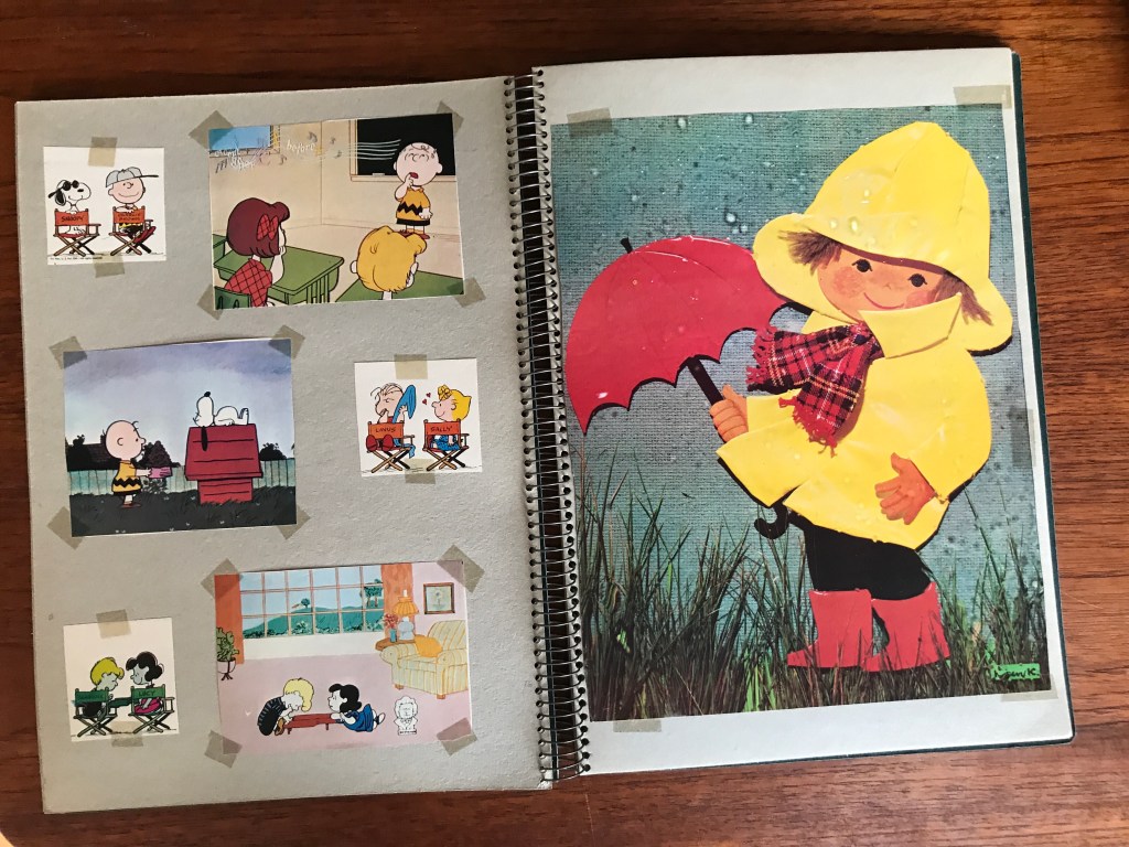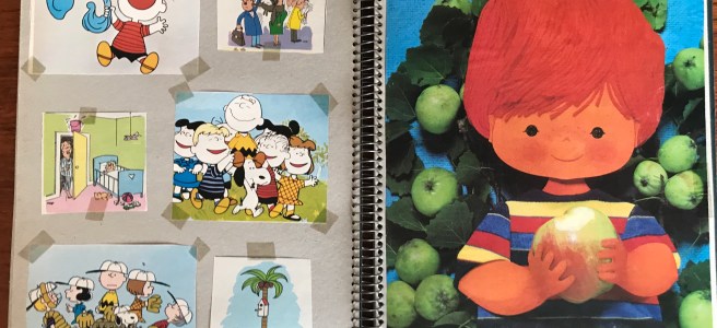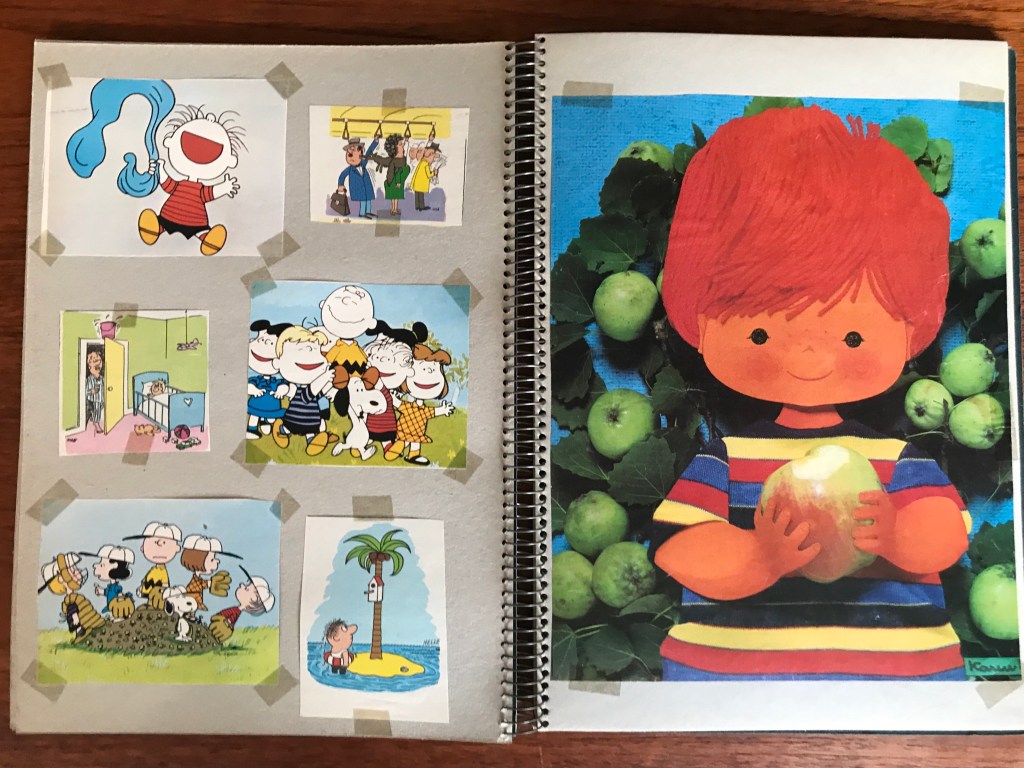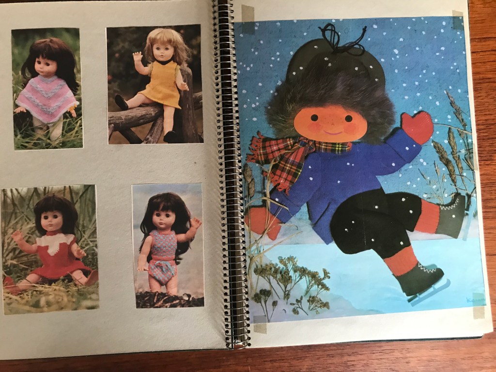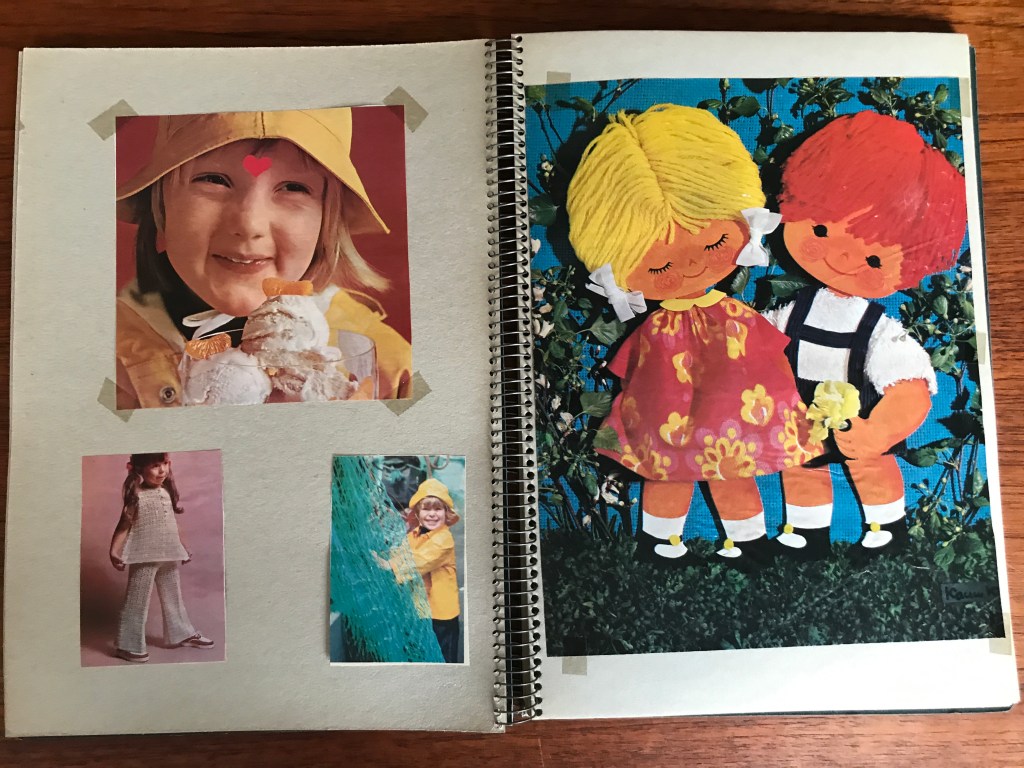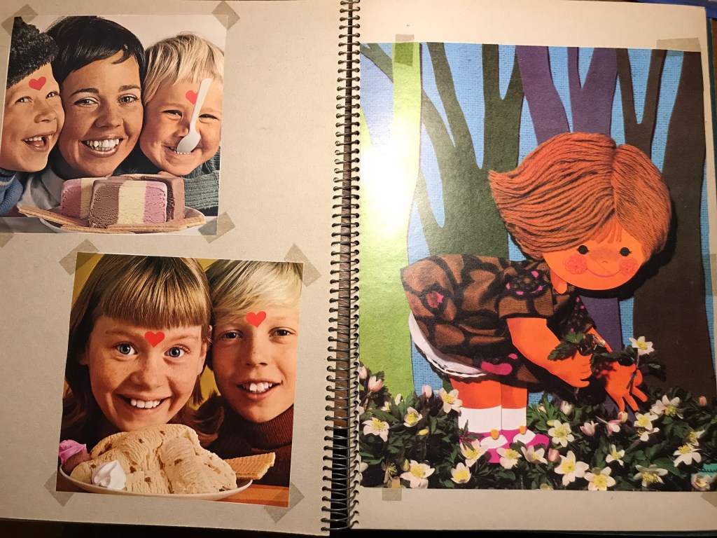 Indholdet i denne scrapbog er dog særlig interessant for mig, da det består af en masse af Karen K.’s gamle forsider fra Familiejournalen. I alt var der 14 flotte helsides kollager af Karen K., som ejeren af udklipsbogen har klippet ud af ugebladets forsider og sat fast i bogen med tape – eller klisterbånd, som vi kaldte det dengang – i hvert fald i Jylland. Familiejournalens navn og forsidens overskrifter er klippet af, så billederne står som selvstændige fine børnebilleder.