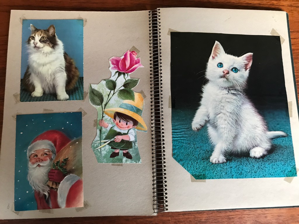 Hvem er det mon, som i 1972 har klistret billeder ind i denne udklipsbog? Da jeg ikke kender bogens proveniens eller ophav, måtte jeg lege detektiv og lede efter spor. Og to postkort bagest i bogen afslører det formentlig. På de sidste sider i bogen er vedkommende løbet tør for Karen K. billeder og har brugt andre nuttede billeder, bl.a. to postkort og den bedårende kattekilling (Miss Ege) fra den legendariske Egetæpper reklame, som denne blogger i hvert fald tydeligt husker selv her så mange år senere.
