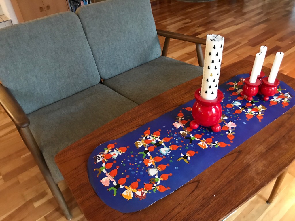 De sidste nykøb til Karen K. samlingen er ikke egentlige bonader, men er ligesom bonaderne trykt på kraftigt papir. Den første er en bordløber eller juledug. Den ligeledes fra firmaet Axel Eliasson, men er nummereret med kun to cifre (76), hvilket jeg tror er en ældre nummerserie end de fircifrede. Den er formentlig fra 1960’erne.