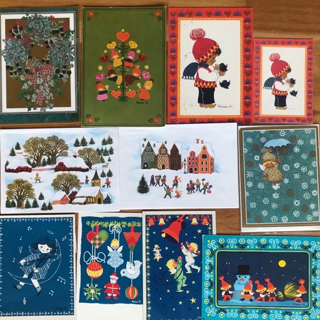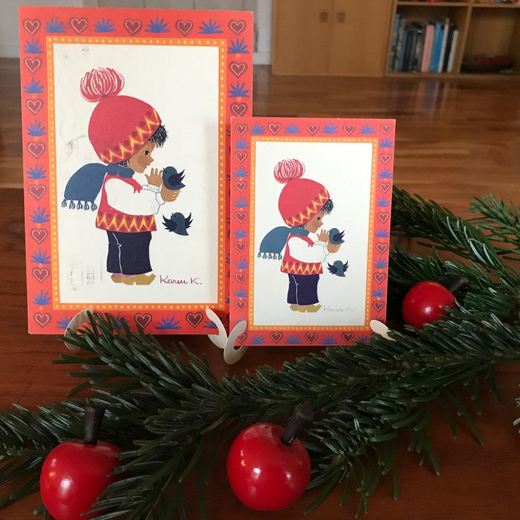 Karen Kjærsgaard, hvis tegninger også var populære i Sverige, bidrog til den svenske bonadstradition både med motiver til påske, jul og resten af året. Langt flest julemotiver dog. Jeg har fundet enkelte af disse gamle plakater her i Danmark, men hovedparten har jeg fra Sverige.
