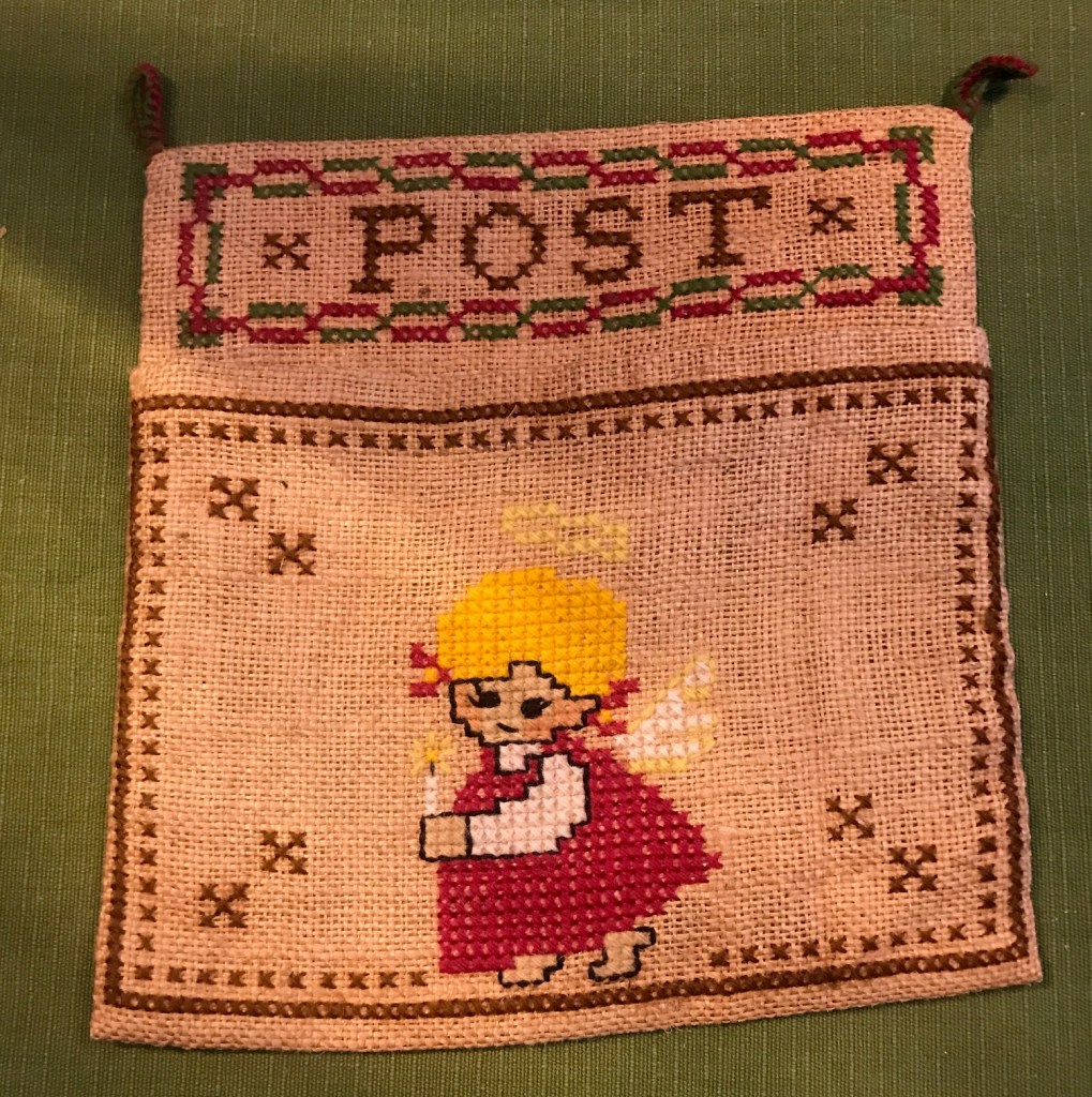 Den er formentlig trykt i Danmark. I hvert fald har den ikke det typiske AE (Axel Eliasson) logo, nummerering og teskten “Svensk tillverkning”, som alle de andre bonader. Oprindeligt lavede Karen K. faktisk dette billede, som en pakkekalender til sin søn, Lars omkring 1967. Det kan du læse om her.