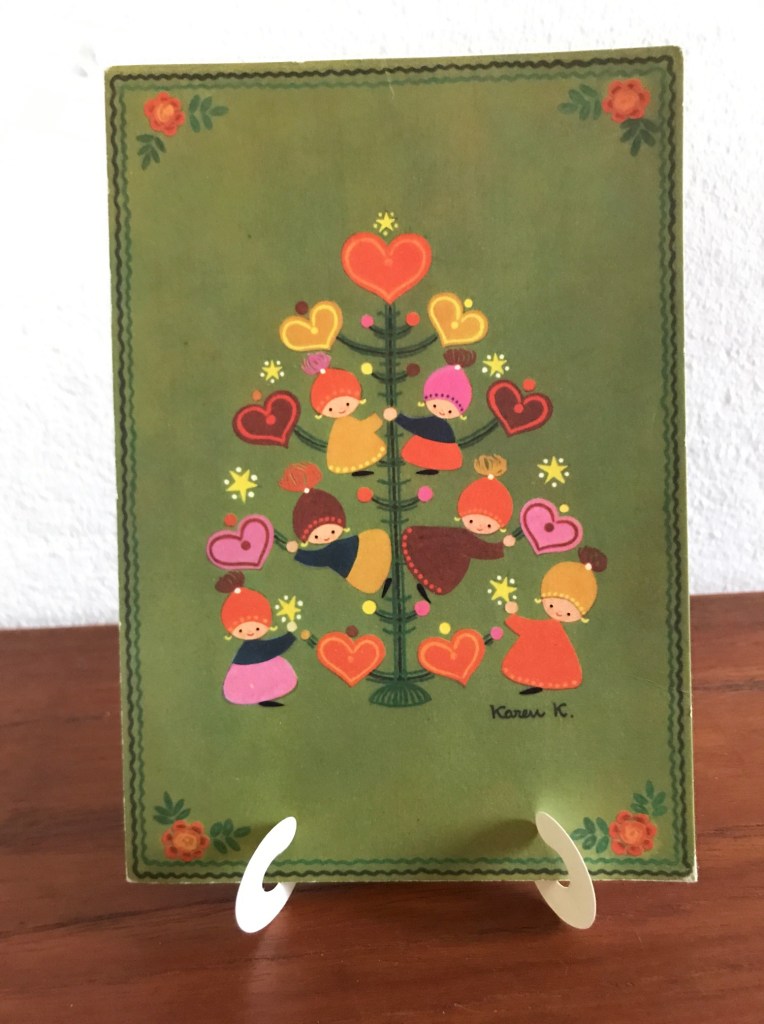 Der er selvfølgelig ingen signatur på denne, men forlagets logo “Axel Elissason” og løbenummer 7070 peger mod en tid, hvor Karen K. lavede designs til dette svensk firma. Fototeknikken og brug af blandede materieler genkendes også hos Karen K.
