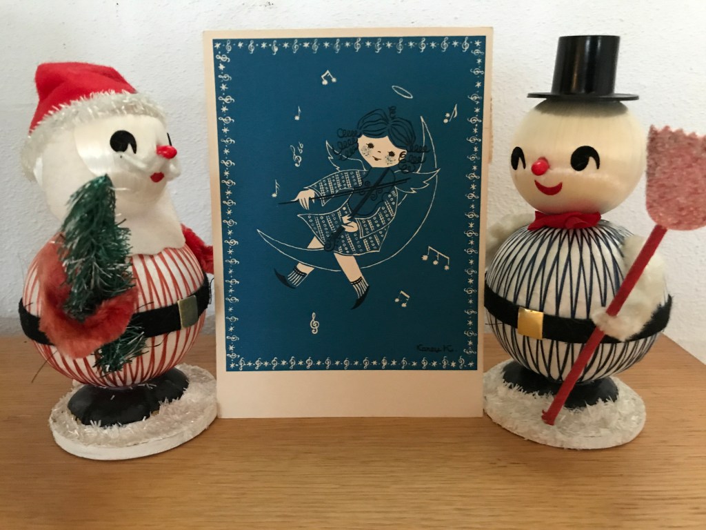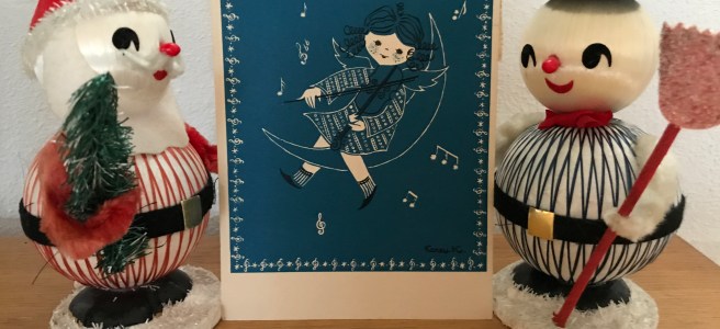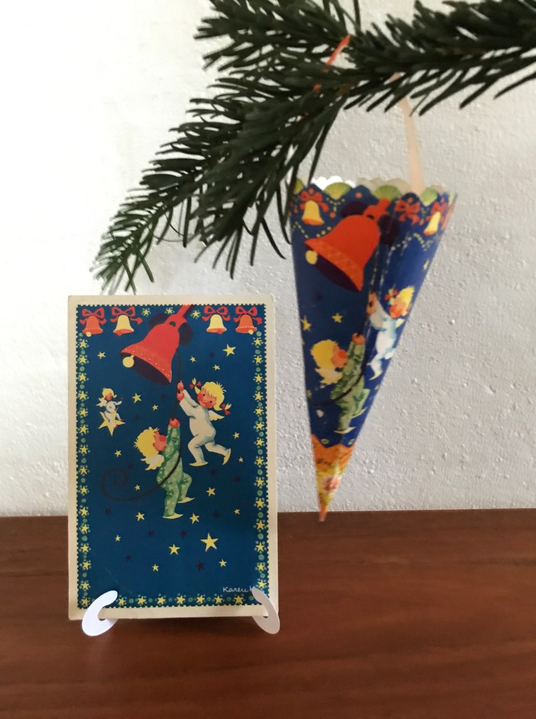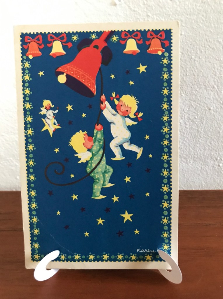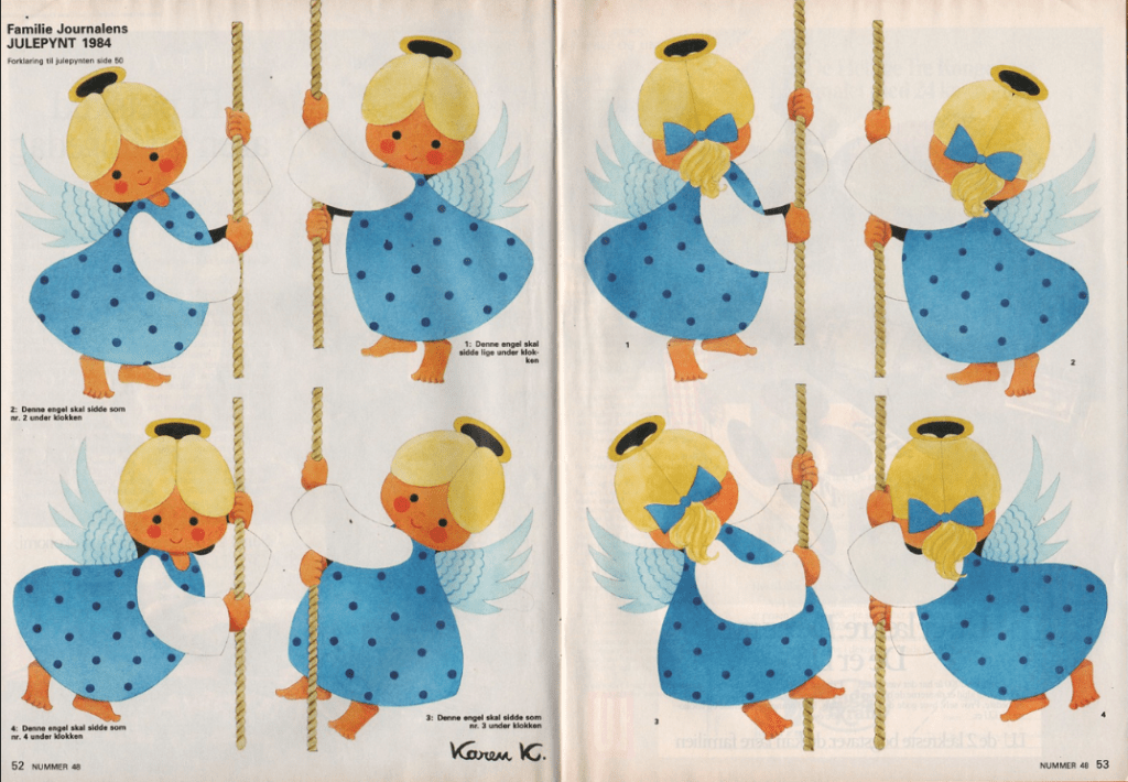 Karen K.’s julbonader stammer fra 1960’erne og 1970’erne, og stilen er knap så myldrende, som de svenske bonader fra 1940’erne og 1950’erne. Jeg tror, Karen K. har været mere inspireret af 60’erne og 70’erne tekstiltryk med et mere skarpskåret og plakat-egnet billedsprog, som f.eks. denne engel trykt på bomuld: