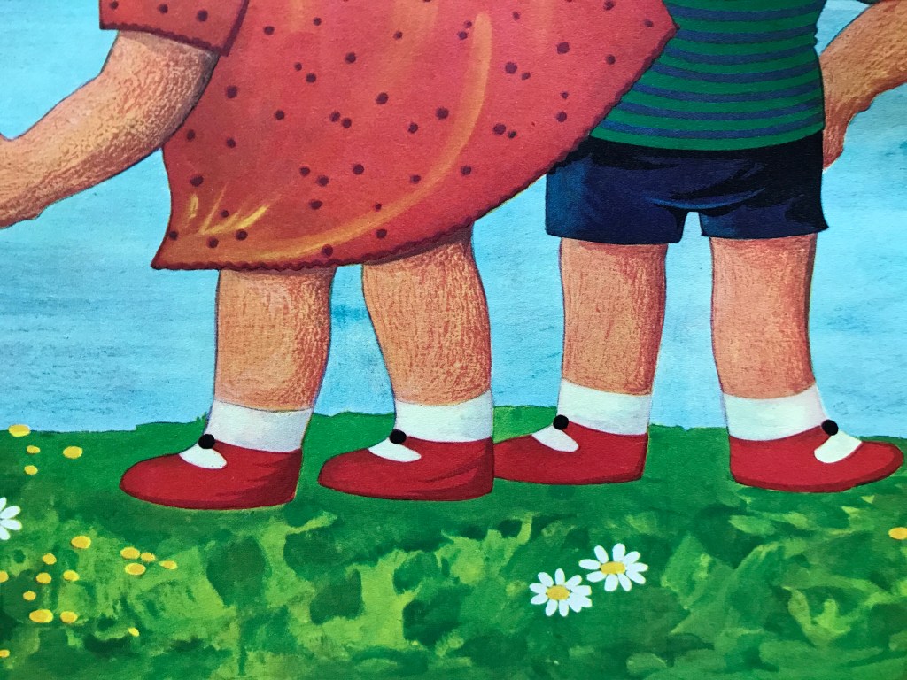 På det sidste sommerbillede er vi kommet længere hen på sommeren. Æblerne er røde på træerne, og der er modne bær på buskene. Børnene har fået fornuftige træsko og gummistøvler på i stedet for de sarte røde sko.