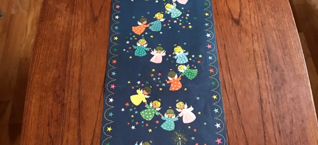 Få dage efter fundet af nissedugen, var jeg igen i en genbrugsbutik og fik øje på en sammenfoldet blå dug på en hylde. Normalt var det ikke noget, jeg ville have kigget nærmere på, men den blå farve virkede bekendt, og den løjerlige kantning af dugen også. Begge dele mindede mistænkeligt om den nyerhvervede blå nissedug. Jeg foldede derfor dugen ud og længst inde i folderne gemte sig de fineste engle.