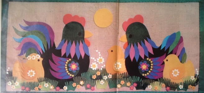 Jeg besluttede at bringe Karen K.’s gamle mønstre til anvendelse. For ikke at sætte min tålmodighed og økonomi på alt for store prøvelser, valgte jeg mig dog at udføre påskehønsene i papir i stedet for i filt. I 1979 var papirklip endnu ikke blevet den folkelige hobby, som det blev i 1980’erne, hvor Kim Larsen sågar indspillede en sang om det!