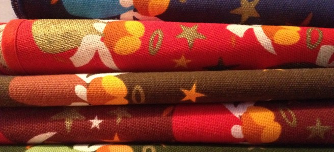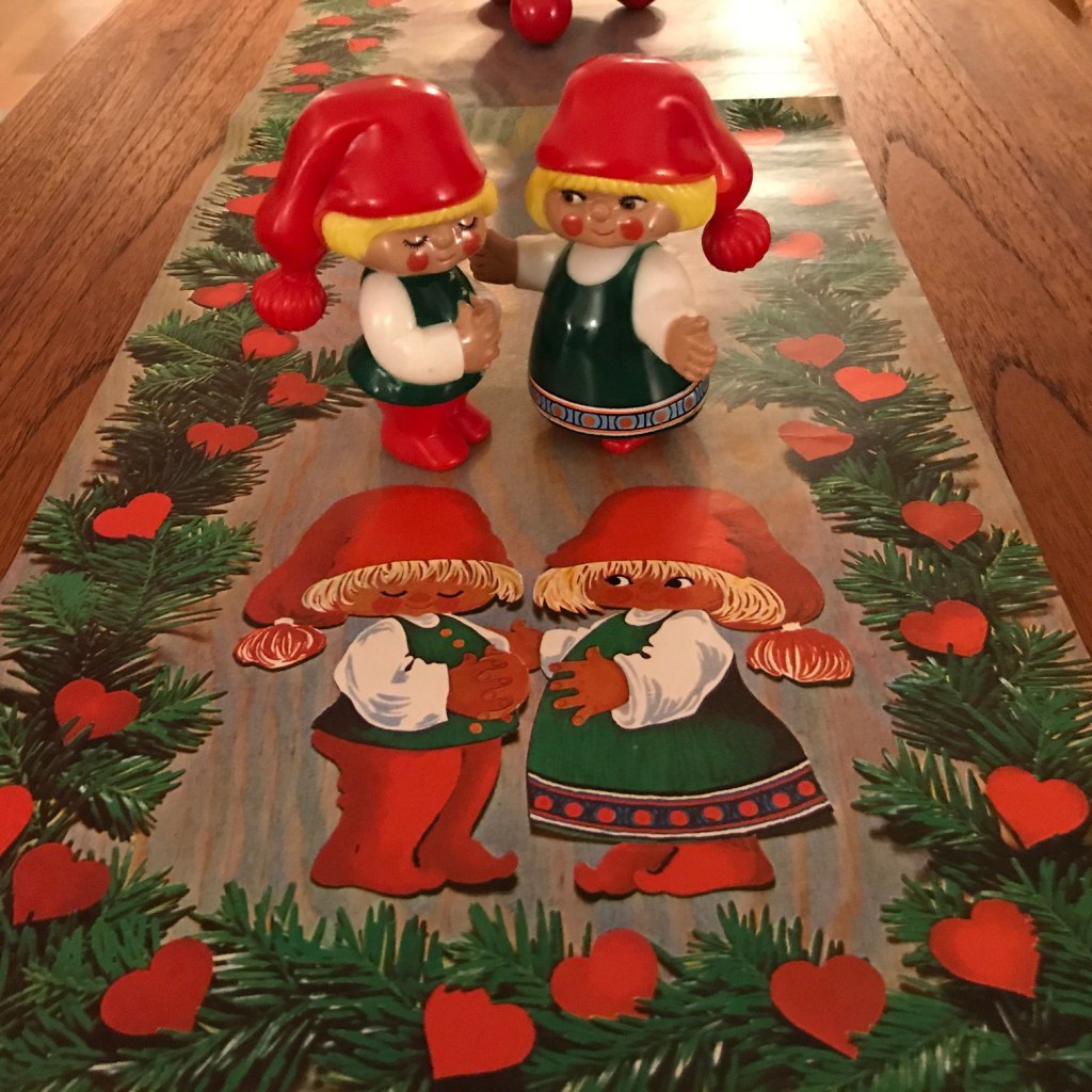 Et andet julestof – som må være fra sidst i 1970’erne eller fra 80’erne er også tydeligt baseret på Karen K.’s tegninger, selv om der ikke er signatur på. Stoffet må være solgt i metermål, i hvert fald har jeg set flere hjemmesyede ting lavet ud af det stof. Bl.a. denne hjemmesyede serviet.