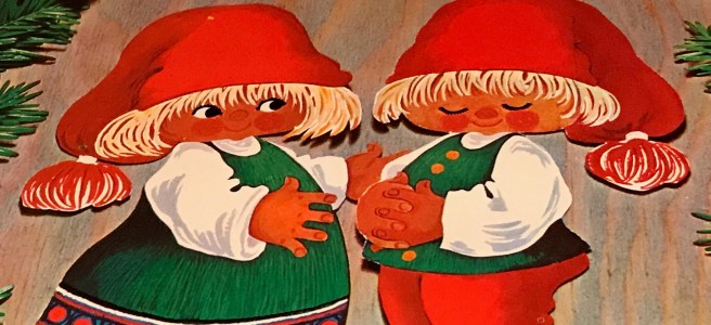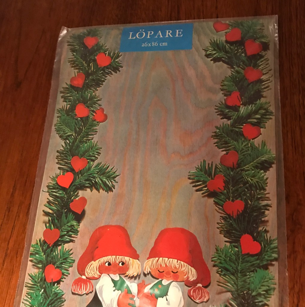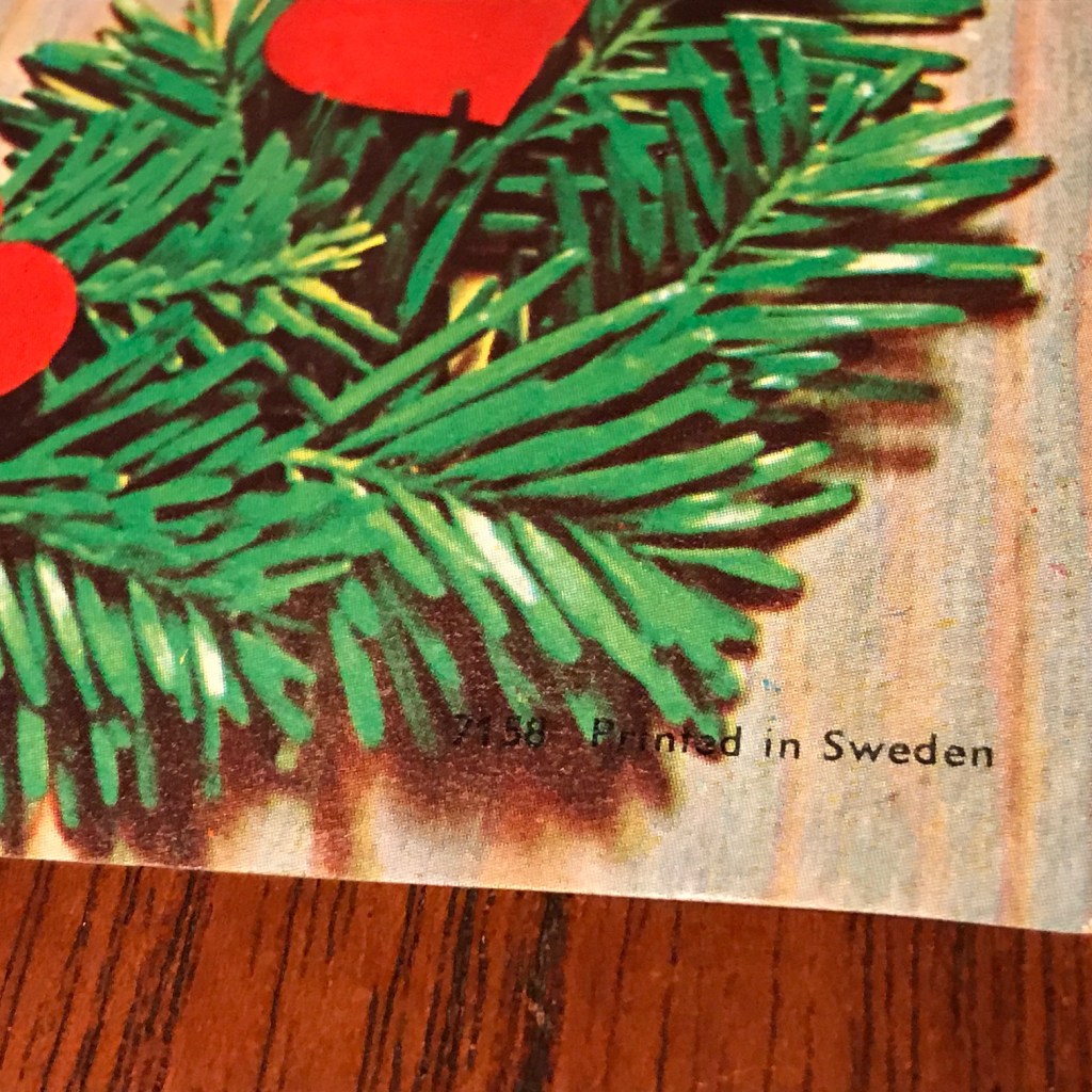 Der er ingen tvivl om at plastiknisserne er lavet efter forlæg fra nisserne på denne juleløber. Men kan vi være sikker på at kunsteren bag tegningerne er Karen K.? Løberen er desværre ikke signeret. Men nisserne har et tydeligt Karen K. præg. Nederst på løberen er med små utydelige bogstaver trykt 7158 Printed in Sweden, hvilket fortæller mig, at den er udgivet af forlaget Axel Eliasson. (Læs mere her.) Måske indikerer “71”, at løberen er trykt i 1971, men det er kun et gæt. Karen Kjærsgaard fremstillede masser af løbere, julefriser og julebilleder (julbonader) for Axel Eliasson i 1960’erne og 1970’erne. Nogle var signerede, andre var ikke.