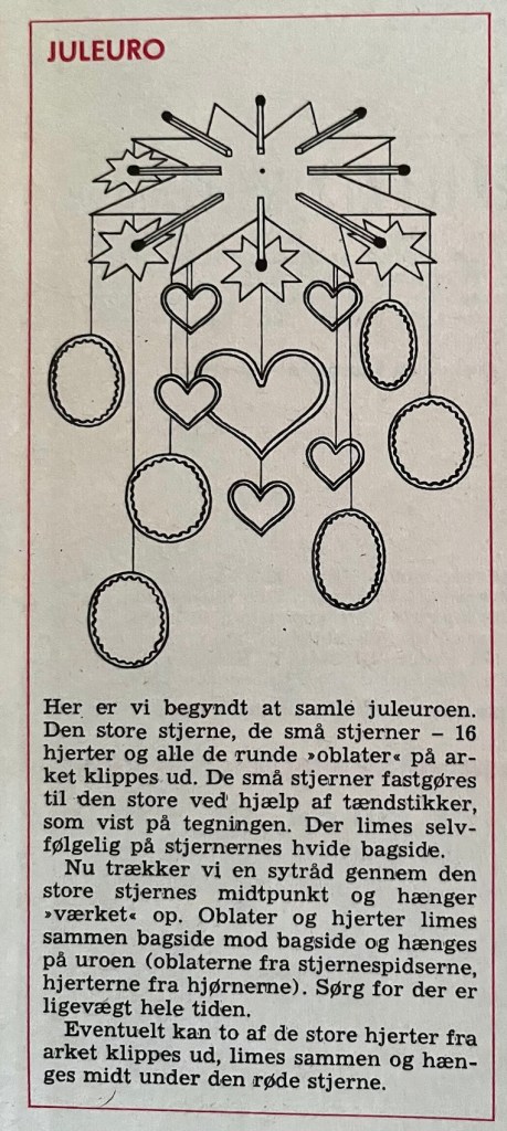 Hvem end den ukendte læser, som samlede uroen, var, så har vedkommende fulgt Karen K. vejledning til punkt og prikke. De små stjerner er monteret med tændstikker. “Oblaterne” hænger ned fra spidsen af den store stjerne, mens de små hjerter hænger fra hjørnerne.
