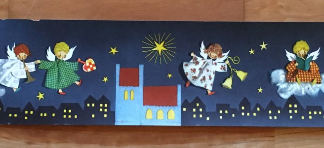 Papiret her med de cirkulerende engle på en flot blå baggrund er dateret til 1987. Det kan godt være lidt ældre, men er altså senest fra 1987.