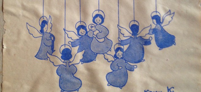 Bag dagens låge i julekalenderen skal I se en lille fin engleuro, som Karen K. har lavet. Jeg gætter på, at denne lille sarte mobile i karton er fra en gang i 1960’erne. I midten ses jomfru Maria med Jesusbarnet, og udenom daler seks engle ned i skjul, som julesangen siger.